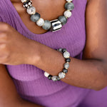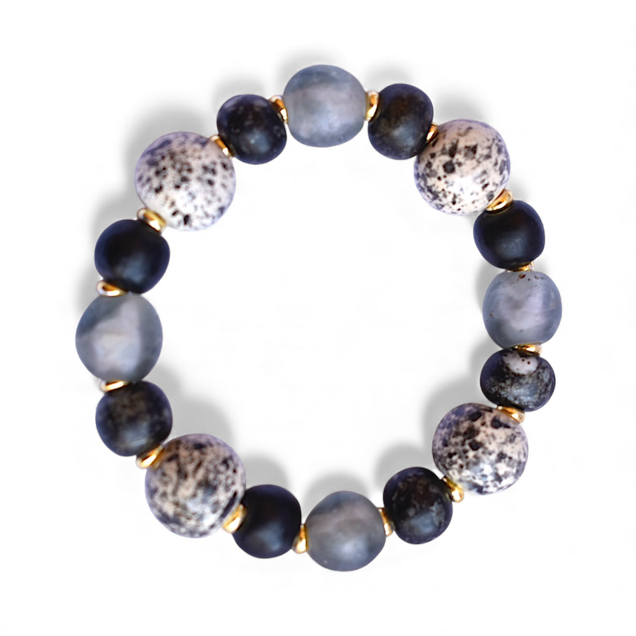 A quiet echo of the mountains — the Mlima Bracelet combines soft frosted glass, speckled and dark charcoal hand painted clay beads - set in a grounded, natural rhythm.