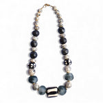 Ethically sourced bone beads are paired with hand painted clay beads and frosted West African glass, reminiscent of river-worn rock. The centerpiece — a bold striped bone bead — anchors the composition with sculptural presence.