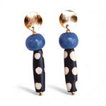 Light, elegant, and full of island character — the Kisiwa Earrings pair a glossy ocean-blue ceramic bead with a long dotted bone bead, suspended from brushed 18k gold-plated studs.
