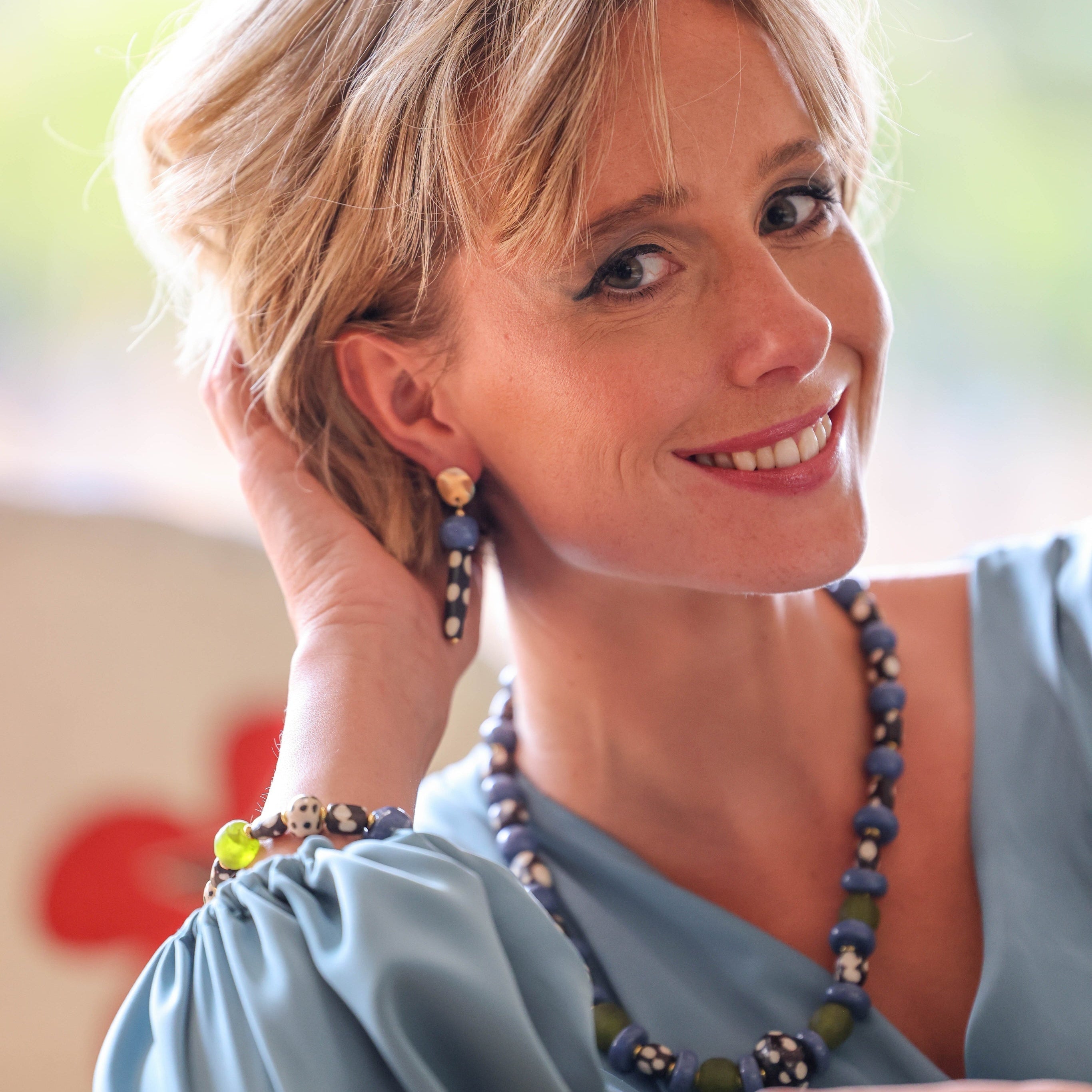 The Nanga Bracelet is a tide pool of color and texture — blue clay beads, seagrass-green glass, speckled ceramic, and dotted bone beads all brought into harmony.